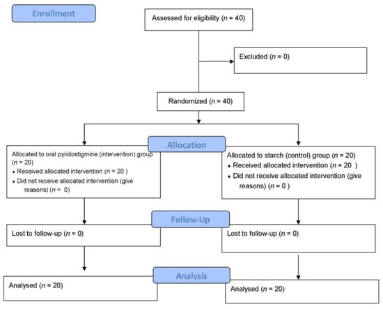 This study was based on a similar study that suggested that at least 20 subjects were required in each group to determine the difference between the two groups (95% confidence interval and 5% error rate) [27]. The patients were examined for the inclusion criteria and 40 patients were randomly selected and assigned to four blocks of 10 patients each by a randomized block sampling method. Using a factorial design, patients were randomly assigned into each group based on type of operation and inclusion criteria. This study was single blind, patients were aware of being involved in the study, but not aware of which group they are in at the time of intervention. The patients were divided into intervention and control groups. In the intervention group, the patients received 60 mg of oral pyridostigmine twice a day via NGTUBE, which started after three days of ileus [23]. In the control group, the patients received starch via NGTUBE twice a day, which started after three days of ileus. The treatment response time and the treatment response frequency were measured by observing or questioning the patient for gas and fecal excretion, which served as the main criteria for measuring the effect of the drug (Figure 1).