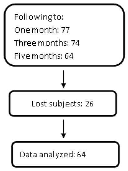 Informative brochures were distributed in the community specifying the objectives of the study and admission criteria: (i) interest in participating in the study; (ii) literacy, low level of schooling (≤6 years of education), high level of schooling (≥7 years of education); and (iii) an absence of handicapping illnesses or serious visual or auditory disabilities. A pre-test/post-test single-group design study was conducted in a convenience sample of 90 community-dwelling older people living in Hidalgo State, Mexico (69 women and 21 men). A total of 13 subjects left the program during the first month, due to the fact that they no longer had enough time to attend the workshop (they took care of grandchildren and/or did housework); and 3 other subjects left the program in the third month due to illness. Therefore, 64 (52 women and 12 men) participants completed the “healthy aging program” workshop. The subjects agreed to participate in the study after providing informed consent. The Ethics Committee of the Universidad Nacional Autónoma de México (UNAM) Zaragoza Campus approved the research protocol for this study (PAPIME PE305516). We measured the self-perception of old age, efficacy of self-care, anthropometry and blood pressure, and biochemical parameters before and after five months of intervention (Figure 1).