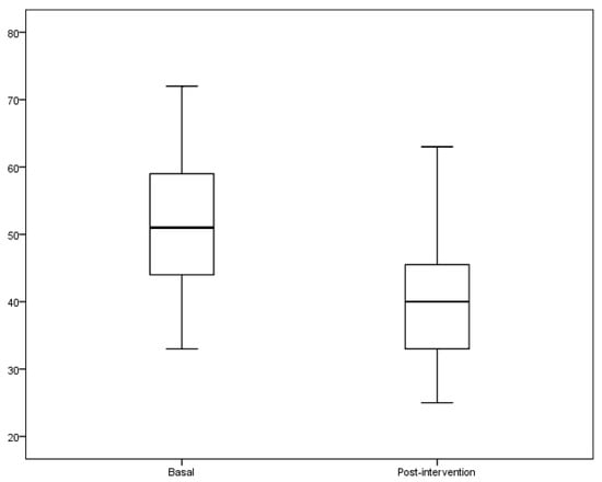 Table 3 shows the socio-demographic characteristics and health status of the study population. In the assessment of self-perception of aging, there was a significant decrease in the mean score of the negative attitudes on the aging scale in the study population after the intervention (baseline of 51 ± 10 vs. post-intervention of 40 ± 9, p < 0.01) (Figure 2), and therefore, an enhancement in positive self-perception of aging. Likewise, in the analysis by quartiles (Q) of the self-perception of old age after the workshop, a statistical decrease was observed, with significant changes in the scores of the Q1 (baseline of 51 ± 10 vs. post-intervention of 40 ± 9, p < 0.05), Q3 (baseline of 55 ± 1 vs. post-intervention of 40 ± 9, p < 0.05) and Q4 (baseline of 63 ± 4 vs. post-intervention of 46 ± 10, p < 0.05) (Table 4).