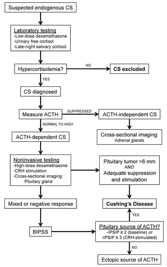 Workup of Cushing’s syndrome. Suspected endogenous Cushing’s syndrome is evaluated in a stepwise manner. BIPSS is indicated when noninvasive testing is inconclusive for diagnosing Cushing’s disease which involves a pituitary source of ACTH. CS: Cushing’s syndrome; ACTH: adrenocorticotropic hormone; CRH: corticotropin-releasing hormone; IPS: inferior petrosal sinus; P: peripheral; BIPSS: bilateral inferior petrosal sinus sampling.