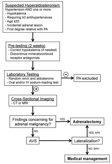 - Funder, J.W.; Carey, R.M.; Mantero, F.; Murad, M.H.; Reincke, M.; Shibata, H.; Stowasser, M.; Young, W.F., Jr. The management of primary aldosteronism: Case detection, diagnosis, and treatment: An endocrine society clinical practice guideline. J. Clin. Endocrinol. Metab. 2016, 101, 1889–1916. [Google Scholar] [CrossRef] [PubMed]