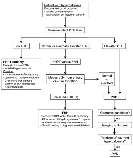 For patients with suspected PHPT, diagnosis is based on clinical and biochemical studies (Figure 3). Hypercalcemia, either corrected using total serum calcium and albumin level or ionized calcium level, is typically documented on more than one occasion before further workup. Next, intact PTH is measured, with elevated levels diagnostic of PHPT. Minimally elevated or upper-normal levels of PTH should prompt a 24-h urinary calcium excretion to distinguish between PHPT versus autosomal dominant familial hypocalciuric hypercalcemia, with possible 25-hydroxyvitamin D levels and/or genetic testing if the resulting calcium/creatinine clearance ratio is indeterminate [].