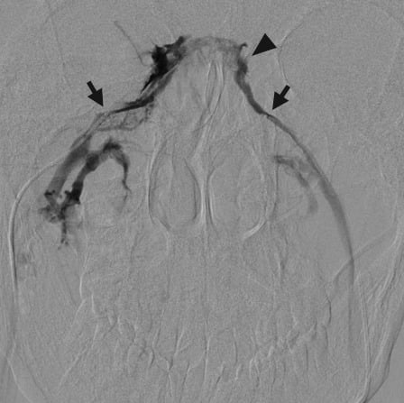 Inferior petrosal sinus venography. During bilateral inferior petrosal sinus sampling, the inferior petrosal sinuses are cannulated with microcatheters (arrows). Gentle hand injection demonstrates contralateral reflux (arrowhead) when the IPS is adequately cannulated.