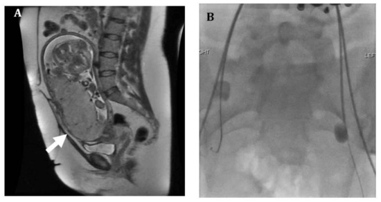 Thirty-three-year-old female with placenta accreta. (A) Sagittal SSFSE MR image shows a thickened placenta with abnormal lobulated contour and loss of myometrial thickness in the lower uterine segment (arrow), suggestive of placenta accreta. (B) Prophylactic bilateral internal iliac artery occlusion balloons were placed prior to hysterectomy. Patient underwent cesarean hysterectomy at 33 weeks with delivery of a healthy newborn. Pathology showed superficial attachment of the placenta to the uterine wall, consistent with placenta accreta.