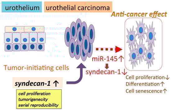 - Fujii, T.; Shimada, K.; Tatsumi, Y.; Hatakeyama, K.; Obayashi, C.; Fujimoto, K.; Konishi, N. microRNA-145 promotes differentiation in human urothelial carcinoma through down-regulation of syndecan-1. BMC Cancer 2015, 15, 818. [Google Scholar] [CrossRef] [PubMed]
