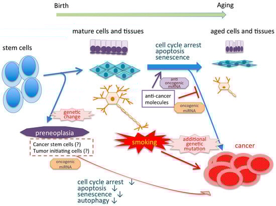 Aging manifests biologically as changes in genome and protein instability, telomeric shortening, nutrient-sensitive abnormalities, mitochondrial dysfunction, cellular senescence, stem cell depletion, and intercellular signal transduction abnormalities [,,]. These molecular dysfunctions mediate apoptosis, cell senescence, and/or autophagy or carcinogenesis by aberrant genomic expression. Various carcinogens produced by smoking accelerate aging accompanied with genomic and molecular changes through genetic modifications or mutations [,,,]. Oncogenic miRNAs inhibit the expression of some tumor suppressor molecules and promote the acceleration of aging with associated carcinogenesis; in contrast, suppression of these miRNAs promotes cellular senescence and decreases cell proliferation [,,].