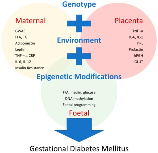 Known pathophysiologic mechanisms in GDM. These mechanisms give rise to potential biomarkers to predict GDM development. There is a complex interplay between maternal, foetal, and placental factors at a cellular level involving genetic, environmental, and epigenetic mechanisms. Abbreviations: GWAS, genome-wide association study; FFA, free fatty acids; TG, triglycerides; TNF-α, tumour necrosis factor alpha; CRP, C reactive protein; IL-6, interlukin-6; IL-12, interlukin-12; IL-1, interlukin-1; hPL, human placental lactogen; hPGH, human placental growth hormone; GLUT, glucose transporter.
