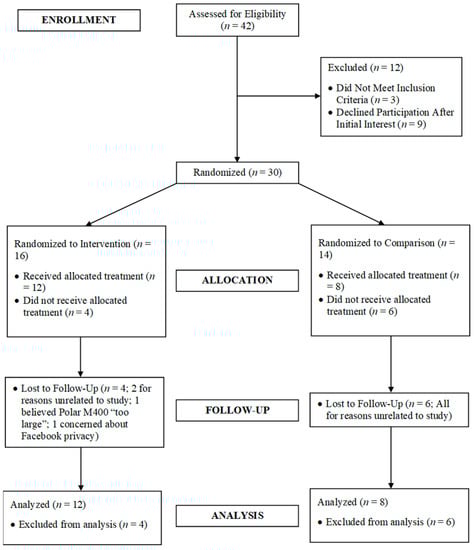 Therefore, the purpose of this 10-week pilot randomized trial was to evaluate the effectiveness of a combined smartwatch and theoretically-based, social media-delivered health education intervention in promoting improved physical activity participation, physiological/psychosocial health, and quality of life as well as reduced sedentary behavior among breast cancer survivors. By providing experimental group participants a Polar M400 smartwatch and a Social Cognitive Theory-based [,], Facebook-delivered health education intervention, it was hypothesized that: (1) experimental group participants would have larger increases in physical activity, energy expenditure, and steps/day in addition to greater decreases in sedentary behavior than comparison group participants receiving only the Facebook-delivered health education intervention given the experimental group’s additional ability to monitor Polar M400 health metrics like steps per day and daily activity duration; (2) experimental group participants would experience greater improvements in weight, body composition, and cardiorespiratory fitness versus comparison. This was hypothesized as it was believed the experimental group might modify caloric consumption and increase physical activity participation based upon the Polar M400’s energy expenditure and steps per day/daily activity time readings, respectively—behaviors which would be supplemented by the health education being delivered via this group’s respective Facebook group; and (3) more favorable changes in Social Cognitive Theory-related psychosocial constructs and quality of life would be observed in the experimental group versus comparison partially resulting from the greater hypothesized changes for physical activity and physiological outcomes among the experimental group. Observations may assist health professionals in developing large-scale, low-burden, and well-integrated physical activity interventions among breast cancer survivors and other clinical populations which can effectively improve health outcomes during or following treatment.