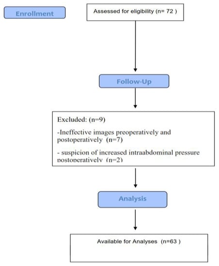 Seventy-two patients were recruited in the study. Ultrasonography of IVC measurement was unsuccessful in 12.5% of patients. A total of 9 patients were excluded; in 7 patients detailed images could not be taken effectively preoperatively and postoperatively, and 2 patients had suspicion of intra-abdominal pressure increase postoperatively due to abdominal surgery. Therefore, evaluation was made with 63 patients (Figure 1). The patients comprised 32 males and 31 females with a mean age of 43.29 ± 17.22 years (range, 18–86 years). Average body mass index was 25.73 ± 4.07 kg/m2. The perioperatively mean infused fluid was 985.80 ± 484.27 mL. The demographic data of the patients are shown in Table 1. The following surgical operations were included: general (n = 33), orthopedic (n = 16), urology (n = 6), otolaryngology (n = 4), neurosurgical (n = 4). The comorbidities were six patients with hypertension (n = 6), diabetes mellitus (n = 4), cardiovascular diseases and respiratory (n = 2).
