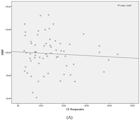 Scatter plots showing the relationships of preoperative (A) and postoperative (B). Mean blood pressure (MBP) and collapsibility index (CI) of inferior vena cava. p > 0.05.