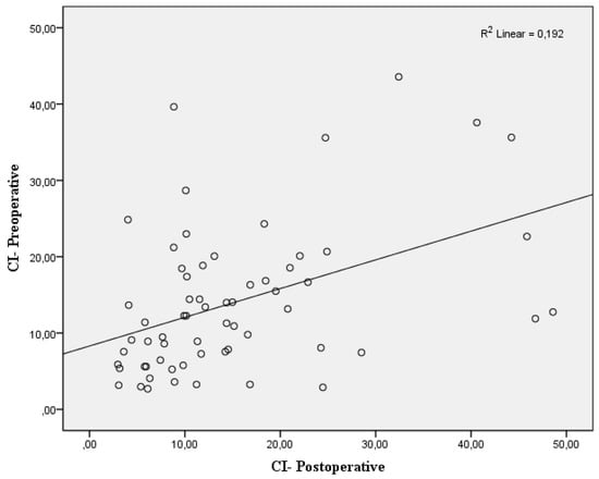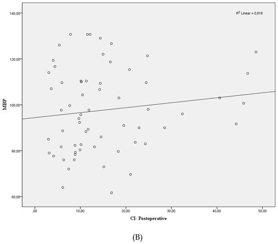 No significant differences were seen between mean arterial pressure and dIVC postperatively (Figure 3A). The correlation coefficient was determined as r = 0.018 (p = 0.31). Similar results were determined in the relationship between mean arterial pressure and dIVC preoperatively (r = 0.005, p > 0.05) (Figure 3B). Positive and statistically significant correlation was found between preoperative CI and postoperative CI (r = 0.438, p < 0.01) (Figure 4).