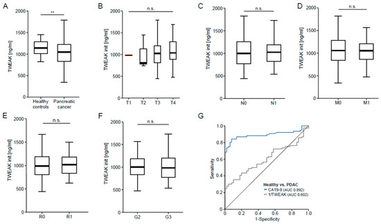 TWEAK serum concentrations are decreased in patients with pancreatic cancer but are independent of the disease stage. (A) Serum TWEAK concentrations were measured in patients with pancreatic cancer and healthy blood donors as controls; (B–F) TWEAK levels were unaltered in patients with different T-status, nodal positive vs. negative disease, metastasized vs. non-metastasized disease, R0 and R1 resected patients, and different tumor gradings; (E) TWEAK levels were unaltered in patients with R0 vs. R1 resection; (G) ROC curve analysis comparing the diagnostic value of TWEAK and CA19-9 for pancreatic cancer.