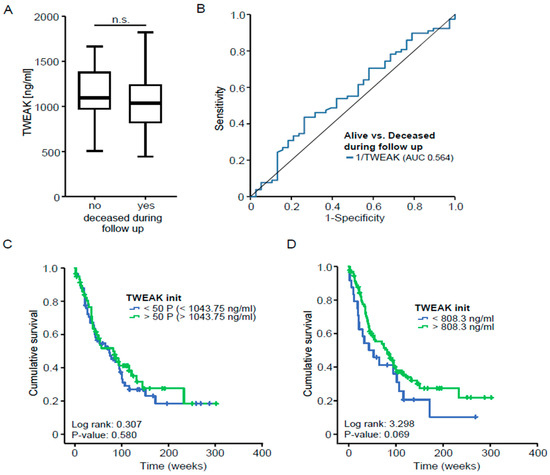 TWEAK serum concentrations do not predict survival in patients with pancreatic cancer. (A) Serum TWEAK concentrations were measured in patients that succumbed to death and survivors; (B) ROC curve analyses determining the prognostic value of TWEAK in patients with pancreatic cancer; (C) Kaplan-Meier curve analysis with respect to patients’ serum TWEAK concentrations (cut-off determined by using the median); (D) Kaplan-Meier curve analysis with respect to patients’ serum TWEAK concentrations (ideal cut-off value).