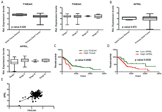 Low intratumoral TWEAK expression levels predict an unfavorable survival in patients with pancreatic cancer. The raw data (count data) for messenger RNA data set were downloaded from (https://portal.gdc.cancer.gov/projects/TCGA-PAAD). (A) Relative TWEAK expression levels are depicted; (B) Relative APRIL expression levels are depicted (C) Kaplan-Meier curve analysis with respect to patients’ TWEAK expression; (D) Kaplan-Meier curve analysis with respect to patients’ TWEAK expression; (E) Correlation analysis between relative TWEAK and APRIL expression.
