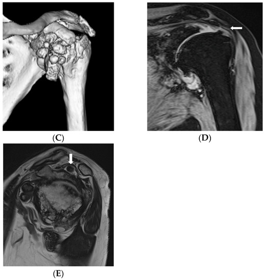 Preoperative evaluation. (A,B) On plain radiographs and computed tomography (CT), multiple well-demarcated, ossified masses were observed; (C) on three dimensional CT, nodular calcified lesions were similarly present; (D) magnetic resonance imaging (MRI) showed a massive tear of the supraspinatus tendon; (E) on T2-enhanced images, a hypointense mass-like lesion was found. There were many masses in the shoulder subacromium and humeral head space.