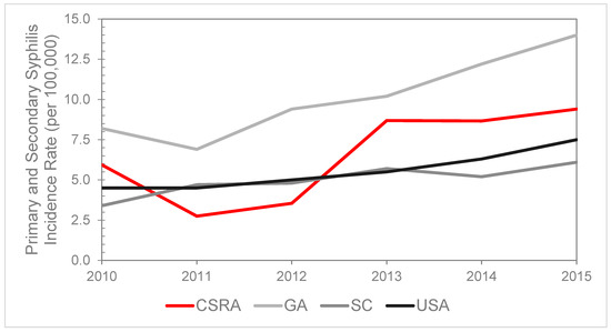 Incidence rate of primary and secondary syphilis in the Central Savannah River Area (CSRA) region compared to Georgia (GA), South Carolina (SC), and the national rates from 2010–2015.