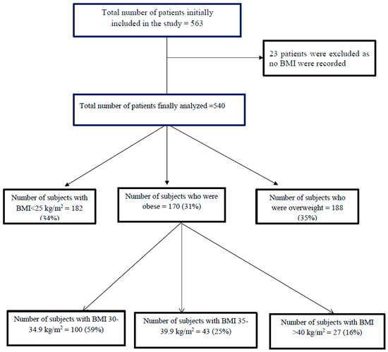 During the study period, 563 patients were admitted to the medical floor, of those, 540 admission were eligible for the study, and 23 patients were excluded because of the absence of recorded height and BMI. A total of 540 consecutive patients were included in this analysis (Figure 1).