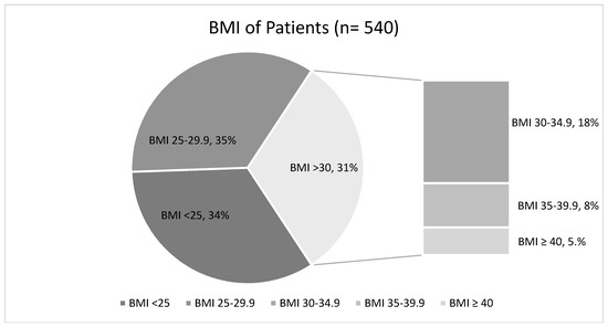 Demographic characteristics are shown in Table 1. Patient age ranged from 21–94 years (mean age 66 ± 6 years). Out of 540 patients, only 182 (34%) had normal weight, 188 (35%) of the patients were overweight and 170 (31%) patients were obese (Figure 2). Of the obese group, 100 (59%) had class I obesity, 43 (25%) had class II obesity and 27 (16%) had from class III obesity (Figure 2). Average BMI of all the patients was 28 kg/m2. Only 40 (23.5%) patients had obesity documented on the admission problem list and only 21 (12%) had obesity documented as a discharge diagnosis. Only 3 (2%) patients were given appropriate counseling and referral for obesity management during the discharge. Comorbidities and their prevalence included, hypertension (68%), diabetes (35%), hyperlipidemia (36%), coronary artery disease (18%), chronic kidney disease (17%), congestive heart failure (18%) and COPD (24%) (Table 2). There is no significant difference in our cohort. This study also found that diabetes mellitus type 2 (normal weight 15%, overweight 27%, obese 24%; p < 0.001) and obstructive sleep apnea (normal weight 2%, overweight 5%, obese 5%; p = 0.004) to have significantly increased prevalence in the overweight and obese patients compared to the normal weight. The average length of hospital stay was about 4.5 ± 0.5 days was similar to all three groups (normal weight, overweight and obese patient). The prevalence of obesity was 56% for females and 44% for male patients.