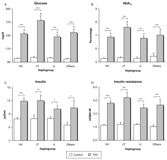Glycaemic control and insulin resistance-related parameters in healthy controls and type 2 diabetic patients belonging to the main mitochondrial macro-haplogroups. (A) Serum levels of fasting glucose (expressed as mg/dL); (B) Percentage of glycated haemoglobin (HbA1c) levels; (C) Serum levels of fasting insulin (μUI/mL); (D) HOMA-IR index calculated as [fasting insulin (μU/mL) × fasting glucose (mg/dL)]/405. Only patients not treated with insulin therapy are included in the graphs of fasting insulin and HOMA-IR. Grey bars show type 2 diabetic patients and white bars represent controls. * p < 0.05; ** p < 0.01; *** p < 0.001 when compared controls vs. type 2 diabetic subjects. Letters indicate significant differences among type 2 diabetic patients with different haplogroups (p < 0.05) when compared by means of one-way ANOVA followed by Student-Newman-Keuls post-hoc test (i.e., bars tagged with the same letter do not differ significantly from each other, while bars with no letter in common are significantly different from each other (p < 0.05)). Abbreviations: HbA1c, glycated haemoglobin; HOMA-IR, Homeostasis model assessment index of insulin resistance; T2D, Type 2 diabetes.
