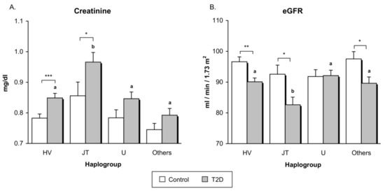 Assessment of renal function in healthy volunteers and type 2 diabetic patients subdivided by mitochondrial haplogroup. (A) Concentrations of serum creatinine; (B) Levels of estimated glomerular filtration rate (eGFR). White bars correspond to controls, while grey bars represent type 2 diabetic patients. * p < 0.05; ** p < 0.01; *** p < 0.001 in controls vs. type 2 diabetic subjects. Letters indicate significant differences among type 2 diabetic patients with different haplogroups (p < 0.05) when compared by means of one-way ANOVA followed by Student-Newman-Keuls post-hoc test (i.e., bars tagged with the same letter do not differ significantly from each other, while bars with no letter in common are significantly different from each other, (p < 0.05)). Abbreviations: eGFR, estimated glomerular filtration rate; T2D, Type 2 diabetes.