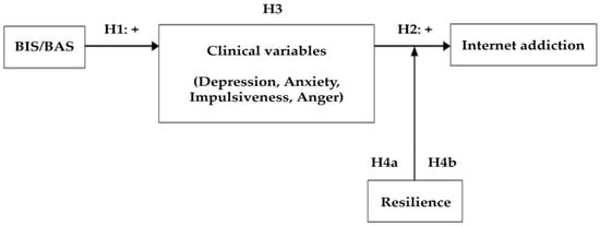 With this background, this study aimed to identify a pathway by which resilience moderated the effects of BIS/BAS on Internet addiction through multiple clinical variables in adolescents. Further, we considered that there would be sex differences in this pathway, both in the mediation model and moderation model, and thus examined it separately for boys and girls. To our knowledge, the comprehensive studies incorporating risk factors, mediating factors, protective factors, and sex differences in Internet addiction are scarce. Thus, we expected that this study would provide an in-depth view of Internet addiction in adolescents. Our hypotheses are as follows: (1) BIS/BAS will be positively correlated with clinical variables, (2) clinical variables will be positively correlated with Internet addiction, (3) clinical variables will mediate the relationship between BIS/BAS and Internet addiction, (4a) the positive relationship between clinical variables and Internet addiction will be stronger for adolescents with low resilience than for those with high resilience, (4b) resilience will moderate the indirect effect of BIS/BAS on Internet addiction (through clinical variables). Specifically, clinical variables will mediate the indirect effect of BIS/BAS when resilience is low but not when high, and (5) the pathway through which resilience moderates the effects of BIS/BAS on Internet addiction, through multiple clinical variables, will differ by sex. Figure 1 depicts overall hypotheses of this study.