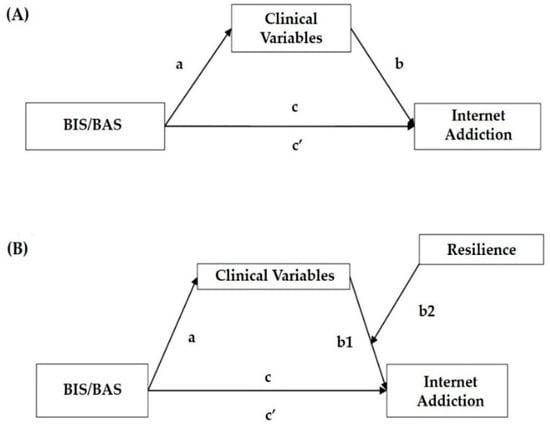 (A) Simple mediation and (B) moderated mediation model. Note. BIS/BAS = Behavioral Inhibition System/Behavioral Activation System; a, b, c, and c’ represent each path coefficient; a: Effect of BIS/BAS on mediating variable; b: Effect of mediating variables on Y-IAT’; c: Direct effect of BIS/BAS on Y-IAT with controlling mediating effect; and c’: Total effect of BIS/BAS without controlling mediating effect.