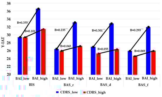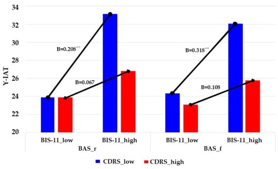Furthermore, we plotted these cross-product terms, developing separate equations that used one standard deviation above and below the mean of CDRS to represent high versus low for each respective variable [70]. Figure 3 and Figure 4 show the interactions between BAI/BIS-11 and CDRS. We also performed simple slope analyses, following the process described by Preacher et al. [79]. Consistent with Hypothesis 4a, the slope of the relationship between BAI and Y-IAT was steep for students with low CDRS (simple slope = 0.390, t = 2.230, p = 0.027 for BIS; simple slope = 0.353, t = 9.067, p = 0.000 for BAS_r; simple slope = 0.320, t = 8.040, p = 0.000 for BAS_d; simple slope = 0.323, t = 8.730, p = 0.000 for BAS_f), whereas the slope was relatively shallow for those with higher CDRS (simple slope = 0.111, t = 0.487, p = 0.626 for BIS; simple slope = 0.064, t = 0.436, p = 0.663 for BAS_r; simple slope = 0.058, t = 0.393, p = 0.694 for BAS_d; simple slope = 0.076, t = 0.520, p = 0.603 for BAS_f). Similarly, the slope of the relationship between BIS-11 and Y-IAT was steep for students with low CDRS (simple slope = 0.509, t = 42.771, p = 0.000 for BAS_r; simple slope = 0.430, t = 29.292, p = 0.000 for BAS_f), whereas the slope was relatively shallow for those with higher CDRS (simple slope = 0.162, t = 1.064, p = 0.288 for BAS_r; simple slope = 0.146, t = 0.962, p = 0.337 for BAS_f).