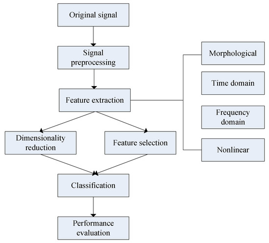 In this work, we proposed a novel computerized analysis method using FHR signals, which aims to provide medical decision support based on advanced signal process methods and machine learning (ML) algorithms. The procedure is illustrated in Figure 1 and consists of the following major steps: Signal preprocessing, feature extraction and selection (dimensionality reduction), classification, and performance evaluation. The work has several innovative aspects: (i) We took the FHR signal into consideration comprehensively and extracted a great number of relevant features, including morphological, time and frequency, and nonlinear domains; (ii) feature selection algorithms were applied to determine which features are more informative for classifying the fetal pattern; and (iii) ensemble learning was used to discriminate between two fetal states: Normal and pathological.