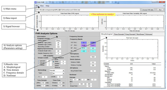The graphical user interface of the computerized analysis software of the FHR signal (CAS-FHR) is divided into five segments: (1) Main menu; (2) Data import; (3) Signal browser; (4) Analysis options (Parameter settings); and (5) Results viewer. The results viewer can be further divided into morphological, time and frequency domain and nonlinear results.
