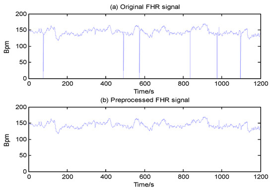 In clinical practice, during the recording process using Doppler ultrasound, the FHR signal contains many artifacts or spikes due to maternal and fetal movements or transducer displacement [1]. Therefore, before further analysis, we eliminated noise to obtain a relatively pure signal for more accurate results, as described in Reference [18]. In this work, we employed a preprocessing algorithm involving three steps. Assume x(i) is an FHR signal with unit of beats per min (bpm) and a sample frequency of 4 Hz, where i = 1,2, ..., N and N is the number of samples.