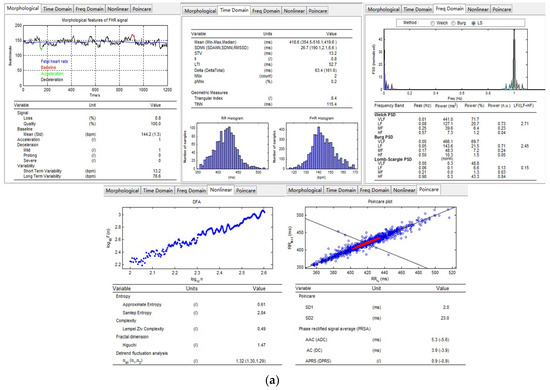 The obstetricians were able to utilize the computerized software to analyze the FHR signals and obtain all the mentioned features automatically. Figure 4 shows a comprehensive list of the extracted features of the different domains in the form of tables and graphs.