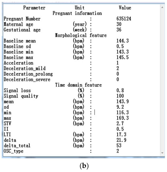 The results of the feature extraction algorithm of No. 1001 FHR recording (internel database number) using CAS-FHR. (a) The results are viewed in the software interface, inlcuding the morphological, time and frequency domain and nonlinear features; (b) The results are saved in txt format for further analysis.