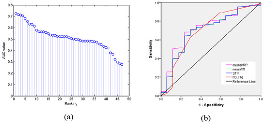 The result of feature selection using area under the curve (AUC). (a) The AUC value of a total of 47 individual features for classifying the fetal state in descending order; (b) The receiver operating characteristic (ROC) curve for the top four features used in the diagnosis of a pathological situation: MedianRR, AUC = 0.73 (95% CI, 0.62–0.86), p = 0.001; meanRR, AUC = 0.72 (95% CI, 0.60–0.84), p = 0.003; STV, AUC = 0.71 (95% CI, 0.60–0.83), p = 0.003; FD_Hig, AUC = 0.71 (95% CI, 0.59–0.83), p = 0.005.