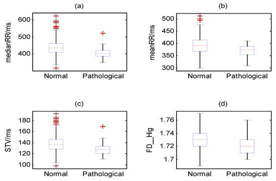 The distribution of normal and pathological classes for the four most highly ranked features (medianRR, meanRR, STV, and FD_Hig) using box plots.