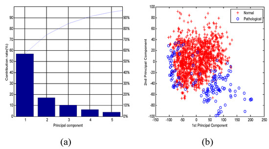 (a) Principal components (PCs) based on the contribution rate using principal component analysis (PCA); (b) The distribution between the first PC and second PC for two groups (normal and pathological).