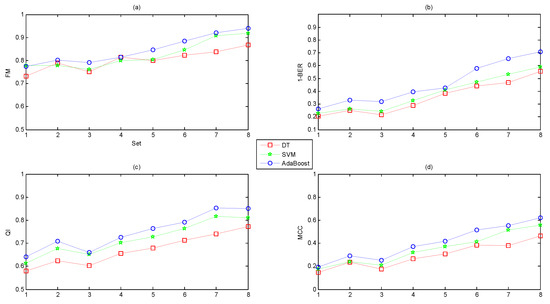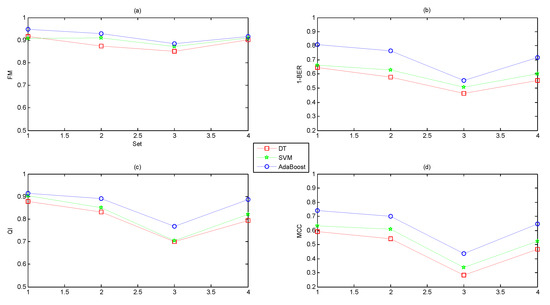 Regarding the four measurements (FM, QI, MCC and BER), the first three showed a positive relationship with performance (higher values correspond to better classifiers); however, the higher the value of BER, the lower the performance was. Therefore, instead of the value of BER, we chose 1-BER as the measurement to transform this to a positive relationship to performance, as for the other three indicators.
