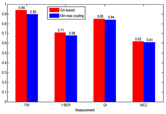 Finally, based on the same dataset (Set Complete) and classifier (AdaBoost), we conducted the comparative experiment regarding the effect of different data normalization methods on classification performance. It can be observed from Figure 10 that the GA-based data normalization method achieved better performance than common min-max scaling, and demonstrated the relationship between the GA and FHR parameters.