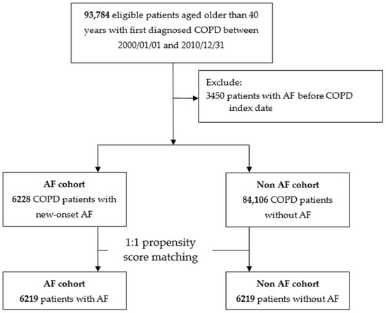The COPD cohort was extracted from National health insurance research database (NHIRD). All patients aged between 40 and 100 years, who had experienced a hospital admission or at least three outpatient visits with a COPD diagnostic code within one year from 1 January 2000 to 31 December 2010 were identified. COPD diagnoses were confirmed by the International Classification of Diseases, Ninth Revision (ICD-9) codes 491, 492, or 496. Patients were excluded for the following reasons: (1) incomplete demographic data, (2) had not undergone a lung function test within one year before or after the COPD diagnosis, and (3) had not received a COPD diagnosis after the lung function test. We also excluded those who were dead or diagnosed with AF prior to being indexed. Overall, 90,334 COPD patients were included in this study cohort.