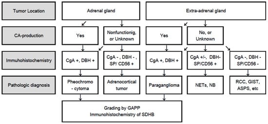 Pathological diagnosis of PPGLs is sometimes difficult for general pathologists due to their very low incidence and histological variety, particularly in cases of non-functioning, or catecholamine data are unknown tumors. For example, adrenocortical carcinoma and neuroendocrine tumors are sometimes misdiagnosed as PPGLs. Gastrointestinal stromal tumors, adult neuroblastoma and alveolar soft part sarcoma are rarely needed for differential diagnosis. Immunohistochemistry is the most useful tool for differential diagnosis. All functioning and non-functioning PPGLs express chromogranin A (CgA) and dopamine β-hydroxylase (DBH) []. CgA is an essential protein for PPGLs as well as for normal adrenal medulla. Thus, if immunohistochemistry for CgA is negative, PPGLs should be ruled out. Other neuroendocrine markers such as synaptophysin and neural cell adhesion molecule (CD56) are general markers for neuroendocrine tumors besides PPGLs, as well as some adrenocortical tumors. Adrenocortical carcinomas or neuroendocrine tumors of other organs are sometimes misdiagnosed as non-functioning PPGLs. Thus, if only synaptophysin and CD56 are positive, this is not sufficient evidence for a diagnosis of PPGL. Tyrosine hydroxylase (TH) and DBH are essential enzymes for catecholamine synthesis and both antibodies are useful for identification of catecholamine-producing tumors. However, some non-functioning PPGLs including only dopamine-producing or SDHB-related PPGLs lack TH immunoreactivity [,], but constantly positive for DBH, making DBH a better marker than TH for identification of PPGLs [,] (Figure 1). A flowchart for pathologically differential diagnosis of PPGLs is presented (Figure 2).
