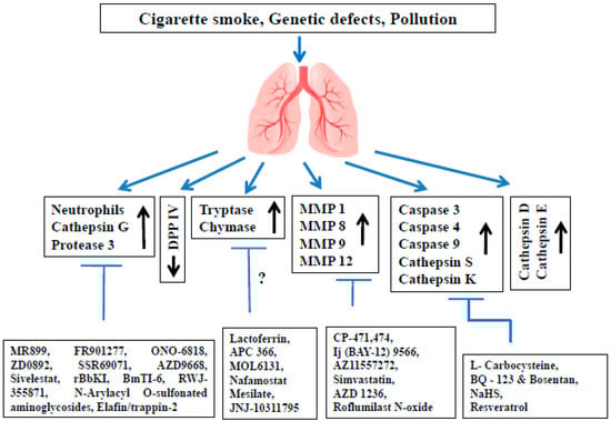 There are four different types of proteases namely serine, cysteine, aspartic, and MMPs which are thought to be involved in the pathogenesis of COPD. Among serine proteases, specifically, neutrophil elastase (NE), dipeptidyl peptidase 4, cathepsin G, proteinase 3, cathepsin C, mast cell-derived tryptase and chymase are found to be associated with the severity of COPD [35,36,37,38,39,40]. The metal-activated proteinases including MMP-2, MMP-8, MMP-9, MMP-12, and MMP-13 are found to be highly expressed in both in vivo models and clinical samples [41,42,43,44,45,46]. The cysteine proteases including caspase-1, caspase-3, caspase-7, caspase-8, caspase-9, caspase-11, cathepsin K, and cathepsin S have also been shown to be up-regulated in COPD patients [47,48,49,50,51,52,53,54,55]. Finally, elevated levels of the aspartic proteases cathepsin D and cathepsin E have been demonstrated in COPD patient tissue and various COPD models [56,57,58,59].