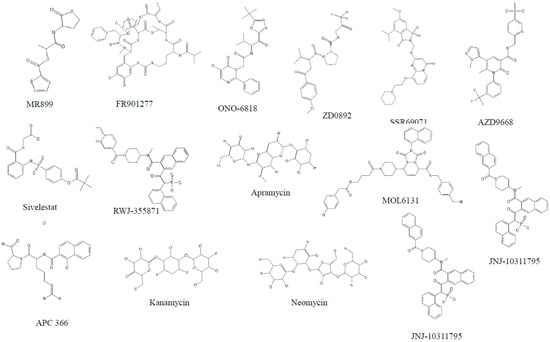 Garavilla et al. described the cat G inhibitory activity of RWJ-355871 in lipopolysaccharide (LPS)-induced acute inflammation model (Figure 1 and Figure 2) [83]. Upon aerosolized instillation of RWJ-355871, levels of exhaled nitric oxide were reduced by 20–37% in this model. In addition, neutrophil, lymphocyte, monocyte, eosinophil, and basophil counts in BAL among in the RWJ-355871 treated group were found to be significantly reduced compared to control groups. In another set of experiments, by the same group, RWJ-355781 treatment did not reduce the total cell count in the BAL of treated animals, however, it reduced the neutrophilic load by 66% in the smoke-induced inflammation model [84]. In addition, RWJ-355781 instillation reduced the levels of keratinocyte-derived chemokine (KC), a murine homolog of IL-8, in a smoke-induced acute inflammation model. These studies demonstrate the efficacy of RWJ-355781 in acute inflammation models. However, in-depth studies in chronic lung models are required in order to establish the potential of RWJ-35578 for the treatment of chronic lung inflammation associated with COPD. Recent studies by Cracian et al. demonstrated the potential of N-Arylacyl O-sulfonated aminoglycosides for cat G inhibition in in vitro models [85]. The aminoglycoside derivatives of neomycin, kanamycin, and apramycin showed significant inhibition of cat G at IC50 doses ranging from 0.42 to 209 µM. However, further in vivo studies will be required to determine the therapeutic potential of these aminoglycosides for the treatment of COPD.