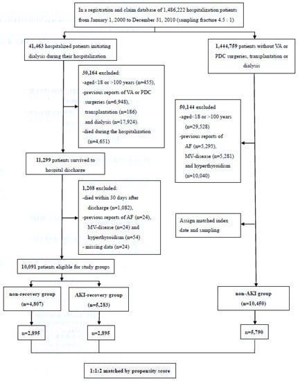 Statistical analyses were performed using SAS 9.4 (SAS Institute, Cary, NC, USA). A two-sided p-value of ≤ 0.05 was considered statistically significant. Continuous variables were presented as the mean ± standard deviation (SD), and categorical variables were described as counts (percentages). The propensity scores were determined by multivariate logistic regression analysis. The Cox proportional hazard model was applied to examine the effect of non-recovery and AKI-recovery groups on subsequent AF development, as well as the influence of AF on other major adverse events. Because withdrawal from dialysis is likely to adhere to the condition of acute kidney disease, advanced CKD was identified to be a time-varying covariate [3,14].