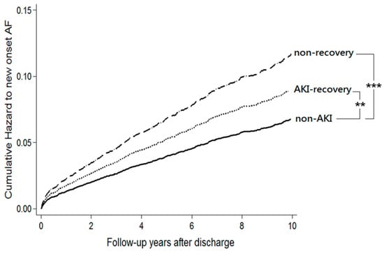Cumulative incidences of atrial fibrillation among the three groups. Note: The analysis was performed using the Cox proportional hazard method with adjustment to the Charlson Comorbidity Index, age, gender and advanced chronic kidney disease (time-varying covariate). *** denotes p < 0.001, ** denotes p < 0.01. Abbreviations: AF, atrial fibrillation; AKI, acute kidney injury.