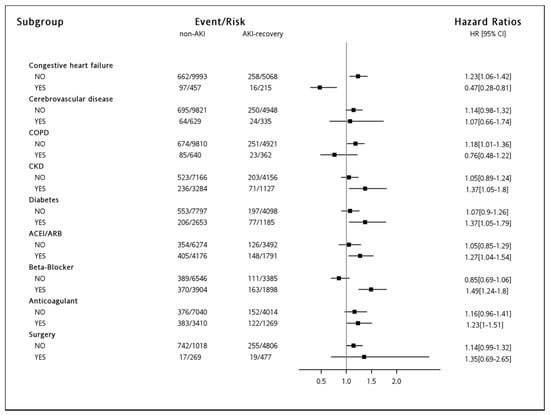 In the subgroup comparison, we found that “AKI-recovery group” has a significantly higher risk of incident AF than the “non-AKI group” in some subgroups. These subgroups included the patients without congestive heart failure (CHF) (aHR = 1.23; 95% CI, 1.06–1.42) and chronic obstructive pulmonary disease (aHR = 1.18; 95% CI, 1.01–1.36), those with CKD (aHR = 1.37; 95% CI, 1.05–1.80) and diabetes mellitus (aHR = 1.37; 95% CI, 1.05–1.79), as well as those receiving angiotensin-converting-enzyme inhibitor (ACEI)/angiotensin receptor blocker (ARB) (aHR = 1.27; 95% CI, 1.04–1.54) and beta-blocker (aHR = 1.49; 95% CI, 1.24–1.80). Additionally, the subgroups who received anticoagulants (aHR = 1.23; 95% CI, 1.00–1.51) had marginally significant increased risks of AF (Figure 3).