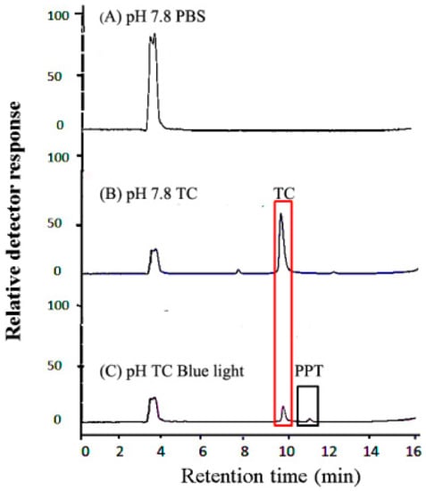 Under blue light illumination, the photochemical products were studied by the LC/MS/MS method, and the ion spectra of PPT are shown in Figure 4. As shown in Figure 4A, total ion chromatogram of an HPLC-MS analysis of the PBS (pH 7.8) was observed at 3.5 min. As shown in Figure 4B, TC was observed at 9.8 min, and the major ion fragment is m/z 445.1 Da in Figure 4D. The PPT was observed at 10.3 min after blue light illumination, as shown in Figure 4C. The mass spectrum of PPT had characteristic ion signals in m/z 459.0, 445.0, and 249.1 Da, as shown in Figure 4E.