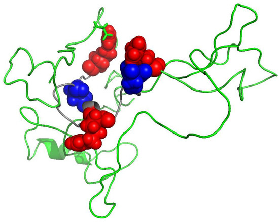 MBP in MS patients is different from MBP in controls. Highlighted in red (Arg) and blue (Asp) are 5 amino acid residues that differ significantly within a 19 amino acid sequence. This cluster includes Arg 31, Asp 34, Arg 43, Asp 48, and Arg 49. For each site, the degree of change is greater in the MS patients; the only exception being Arg 31. Statistical data are shown in Figure 2 and are summarised from Friedrich et al. [9]. The model of MBP was generated using I-Tasser [25] and PyMOL Molecular Graphics System was used to render the 3D structure.