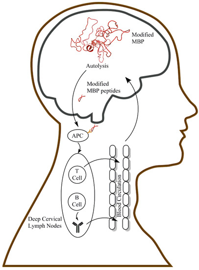 T cells have long been thought to be implicated in MS pathogenesis, in particular the inflammation associated with the condition. Recent studies have also highlighted the important contribution of B cells. Evidence for a major role of B cells in MS is suggested by the clinical benefit derived by peripheral B cell depletion using drugs such as rituximab, an anti-CD20 agent [29]. A possible way in which modified MBP (and other myelin proteins) may elicit an immune response is depicted in Figure 4.