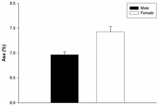 ) subjects. Elevated levels of d-Asx were found in females by comparison to males (p = 0.029, Mann–Whitney U test). Male n = 4, female n = 4, age range 51–87 years. Mean ± SEM.