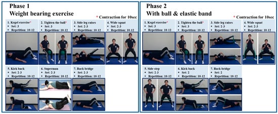 Progressive resistance training focused on pelvic floor muscles was initiated within 2 weeks postoperatively and conducted for 12 weeks thereafter (Figure 1). This intervention recommended that Kegel-based weight-bearing exercise be started at 0–6 weeks (phase 1) postoperatively, and then elastic-band-based high-speed power training until 12 weeks (phase 2). Each session included a 10-min warm-up, 40 min of Kegel-based exercise training and 10 min of cool-down. Resting periods of 1 min were allowed between sets and 2 min between exercises. High-speed resistance training is defined as a contraction phase expected to be accomplished as quickly as possible, with a 1-s pause and an eccentric contraction exceeding 2-s []. High-speed resistance exercise regimens are centered on the use of elastic exercise bands, based on a previous intervention []. The color of the band used served to define the exercise intensity. For the power training phase, green elastic bands (very low tension) were used and participants were instructed to exercise at a rate of perceived exertion of 12–13 (‘somewhat hard’). Each high-speed resistance training exercise consisted of two to three sets of 10–12 repetitions. The exercise guideline and daily exercise checklist were created and distributed to the subjects, and the number of days of exercise was checked by bringing them in during their mid-term visits and the last visit. In addition, we performed different sets and repetitions to set individual exercise intensity. Afterwards, after an intermediate visit, the elastic band was used to increase the intensity of the exercise through tests. The exercise program followed the ACSM’s Guide to Exercise and Cancer Survivorship [].