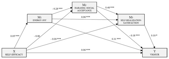 Figure 2 shows the multiple mediation model for Dedication. Following the third regression analysis, with overload as the outcome variable (M3), we estimated the effect of the independent variable and the other mediators. In each case, we saw significant effects: self-efficacy (B = 0.01, p < 0.001), energy–joy (B = −0.18, p < 0.001) and harassment–social acceptance (B = 0.63, p < 0.001). Furthermore, self-efficacy (B = 0.05, p < 0.001), energy–joy (B = 0.36, p < 0.001), harassment–social acceptance (B = −0.31, p < 0.001) and overload (B = 0.12, p < 0.001) had significant effects on Dedication (Y). The overall effect of self-efficacy on Dedication was significant (B = 0.07, p < 0.001).